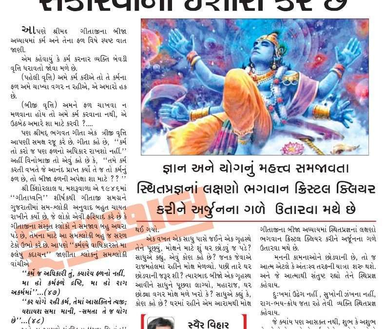 જ્ઞાન અને યોગનું મહત્ત્વ સમજાવતા ગીતાજીના બીજા અધ્યાયમાં સ્થિતપ્રજ્ઞનાં લક્ષણો ભગવાન ક્રિસ્ટલ ક્લિયર કરીને અર્જૂનના ગળે ઉતારવા મથે છે.
