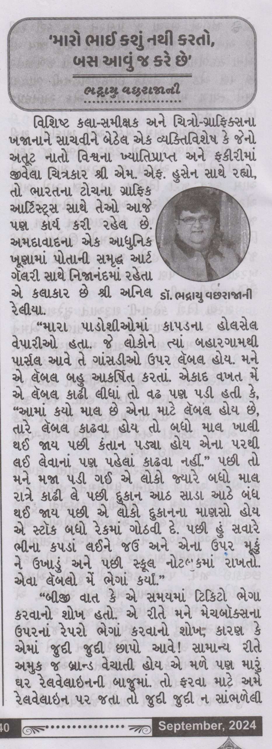 “મારા પાડોશીઓમાં કાપડના હોલસેલ વેપારીઓ હતા, જે લોકોને ત્યાં બહારગામથી પાર્સલ આવે તે ગાંસડીઓ ઉપર લેબલ હોય. મને એ લેબલ બહુ આકર્ષિત કરતા. એકાદ વખત મેં એ લેબલ કાઢી લીધા તો વઢ પણ પડી હતી કે, “આમાં કયો માલ છે એના માટે લેબલ હોય છે, તારે લેબલ કાઢવા હોય તો બધો માલ ખાલી થઈ જાય પછી કંતાન પડ્યા હોય એના પરથી લઇ લેવાના પણ પહેલાં કાઢવા નહીં.” પછી તો મને મજા પડી ગઈ એ લોકો જ્યારે બધો માલ રાત્રે કાઢી લે પછી દુકાન આઠ સાડા આઠે બંધ થઇ જાય પછી એ લોકો દુકાનના માણસો હોય એ સ્ટોક બધો રેક માં ગોઠવી દે. પછી હું સવારે ભીના કપડાં લઈને જઉં અને એના ઉપર મુકું ને ઉખાડું અને પછી સ્કૂલ નોટબુકમાં રાખતો. એવા લેબલો મેં ભેગા કર્યા.”