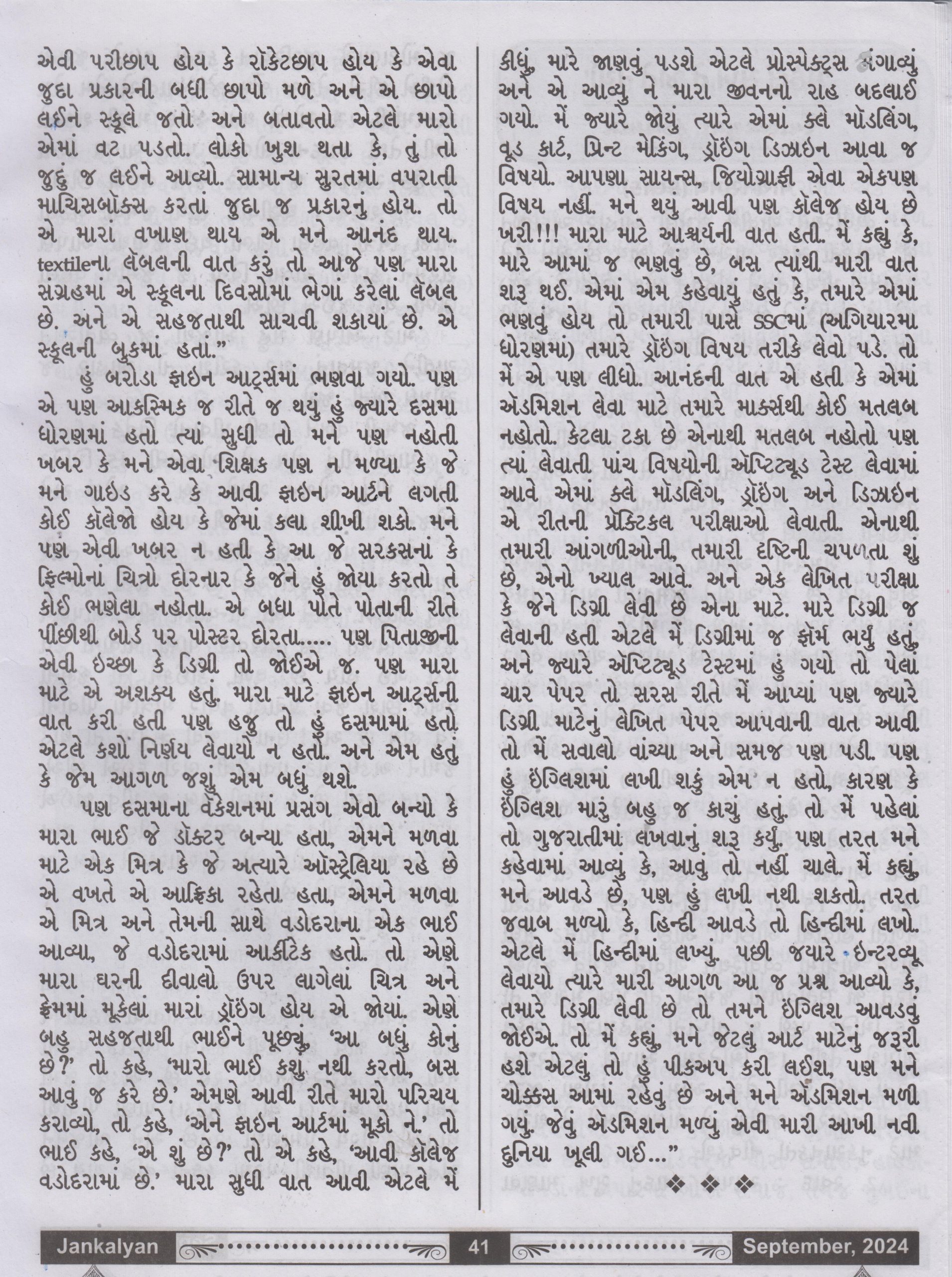 પણ દસમાંના વેકેશનમાં પ્રસંગ એવો બન્યો કે મારા ભાઈ જે ડોક્ટર બન્યા હતા એમને મળવા માટે એક મિત્ર કે જે અત્યારે ઓસ્ટ્રેલિયા રહે છે એ વખતે એ આફ્રિકા રહેતા હતા એમને મળવા એ મિત્ર અને તેમની સાથે વડોદરાના એક ભાઈ આવ્યા, જે વડોદરામાં આર્કીટેક હતો. તો એણે મારા ઘરની દીવાલો ઉપર લાગેલા ચિત્ર અને ફ્રેમમાં મુકેલા મારા ડ્રોઈંગ હોય એ જોયા. એણે બહુ સહજતાથી ભાઈને પૂછ્યું, ‘આ બધું કોનું છે ?’ તો કહે, ‘મારો ભાઈ કશું નથી કરતો, બસ આવું જ કરે છે.’ એમણે આવી રીતે મારો પરિચય કરાવ્યો, તો કહે, ‘એને ફાઈન આર્ટમાં મુકો ને,’ તો ભાઈ કહે, ‘એ શું છે ?’ તો એ કહે, ‘આવી કોલેજ વડોદરામાં છે.’ મારા સુધી વાત આવી એટલે મેં કીધું, મારે જાણવું પડશે એટલે પ્રોસ્પેક્ટ્સ મંગાવ્યું અને એ આવ્યું ને મારા જીવનનો રાહ બદલાઈ ગયો. મેં જયારે જોયું ત્યારે એમાં ક્લે મોડલિંગ, વુડ કાર્ટ, પ્રિન્ટ મેકિંગ, ડ્રોઈંગ ડિઝાઇન આવા જ વિષયો. આપણા સાયન્સ, જિયોગ્રાફી એવા એક પણ વિષય નહીં. મને થયું આવી પણ કોલેજ હોય છે ખરી !!! મારા માટે આશ્ચર્યની વાત હતી. મેં કહ્યું કે, મારે આમાં જ ભણવું છે, બસ ત્યાંથી મારી વાત શરૂ થઇ. એમાં એમ કહેવાયું હતું કે, તમારે એમાં ભણવું હોય તો તમારી પાસે SSC માં (અગિયારમા ધોરણમાં) તમારે ડ્રોઈંગ વિષય તરીકે લેવો પડે. તો મેં એ પણ લીધો. આનંદની વાત એ હતી કે એમાં એડમિશન લેવા માટે તમારે માર્ક્સથી કોઈ મતલબ નહોતો. કેટલા ટકા છે એનાથી મતલબ નહોતો પણ ત્યાં લેવાતી પાંચ વિષયોની એપ્ટિટ્યુડ ટેસ્ટ લેવામાં આવે એમાં ક્લે મોડલિંગ, ડ્રોઈંગ અને ડિઝાઇન એ રીતની પ્રેક્ટિકલ પરીક્ષાઓ લેવાતી એનાથી તમારી આંગળીઓની, તમારી દ્રષ્ટિની ચપળતા શું છે, એનો ખ્યાલ આવે. અને એક લેખિત પરીક્ષા કે જેને ડિગ્રી લેવી છે એના માટે. મારે ડિગ્રી જ લેવાની હતી એટલે મેં ડિગ્રીમાં જ ફોર્મ ભર્યું હતું, અને જયારે એપ્ટિટ્યુડ ટેસ્ટમાં હું ગયો તો પેલા ચાર પેપર તો સરસ રીતે મેં આપ્યા પણ જયારે ડિગ્રી માટેનું લેખિત પેપર આપવાની વાત આવી તો મેં સવાલો વાંચ્યા અને સમજ પણ પડી પણ હું ઇંગલિશ માં લખી શકું એમ ન હતો, કારણ કે ઇંગલિશ મારું બહુ જ કાચું હતું. તો મેં પહેલાં તો ગુજરાતીમાં લખવાનું શરુ કર્યું પણ તરત મને કહેવામાં આવ્યું કે, આવું તો નહીં ચાલે. મેં કહ્યું, મને આવડે છે, પણ હું લખી નથી શકતો. તરત જવાબ મળ્યો કે, હિન્દી આવડે તો હિન્દીમાં લખો. એટલે મેં હિન્દીમાં લખ્યું. પછી જયારે ઇન્ટરવ્યૂ લેવાયો ત્યારે મારી આગળ આ જ પ્રશ્ન આવ્યો કે, તમારે ડિગ્રી લેવી છે તો તમને ઇંગલિશ આવડવું જોઈએ. તો મેં કહ્યું, મને જેટલું આર્ટ માટેનું જરૂરી હશે એટલું તો હું પીકઅપ કરી લઈશ, પણ મને ચોક્કસ આમાં રહેવું છે અને મને એડમિશન મળી ગયું. જેવું એડમિશન મળ્યું એવી મારી આખી નવી દુનિયા ખુલી ગઈ…”