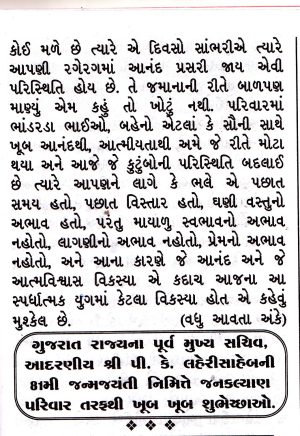 બાળપણની વાતમાં આજે અનેક મિત્રોને યાદ કરું છું. મારા એક મિત્ર શાંતિલાલ, એમણે પ્રિલીમ પરીક્ષા પછી મને જો ગણિત શીખવ્યું ન હોત તો હું ગણિત વિષયમાં ચોક્કસ નાપાસ થાત.એ જ રીતે અનેક મિત્રોએ અમને જે રીતે મદદ કરી અને સૌથી વધારે તો એ દિવસો આનંદના એટલે કે આપણે સંપૂર્ણ ચિંતા મુક્ત જીવનમાં એક નાના ગામમાં ખૂબ સાહજીકતાથી જીવતા હતા. એનો જે અનેરો આનંદ છે એ આજે હવે જે તો મિત્રોની ગેરહાજરી થતી જાય છે અને જે કોઈ મળે છે ત્યારે એ દિવસો સાંભરીએ ત્યારે આપણી રગેરગમાં આનંદ પ્રસરી જાય એવી પરિસ્થિતિ હોય છે. તે જમાનાની રીતે બાળપણ માણ્યું એમ કહું તો ખોટું નથી. પરિવારમાં ભાંડરડા ભાઈઓ, બહેનો એટલાં કે સૌની સાથે ખૂબ આનંદથી, આત્મીયતાથી અમે જે રીતે મોટા થયા અને આજે જે કુટુંબોની પરિસ્થિતિ બદલાઈ છે ત્યારે આપણને લાગે કે ભલે એ પછાત સમય હતો, પછાત વિસ્તાર હતો, ઘણી વસ્તુનો અભાવ હતો, પરંતુ માયાળુ સ્વભાવનો અભાવ નહોતો, લાગણીનો અભાવ નહોતો, પ્રેમનો ભાવ નહોતો, અને આના કારણે જે આનંદ અને જે આત્મવિશ્વાસ વિકસ્યા એ કદાચ આજના આ સ્પર્ધાત્મક યુગમાં કેટલા વિકસ્યા હોત એ કહેવું મુશ્કેલ છે. (વધુ આવતા અંકે)